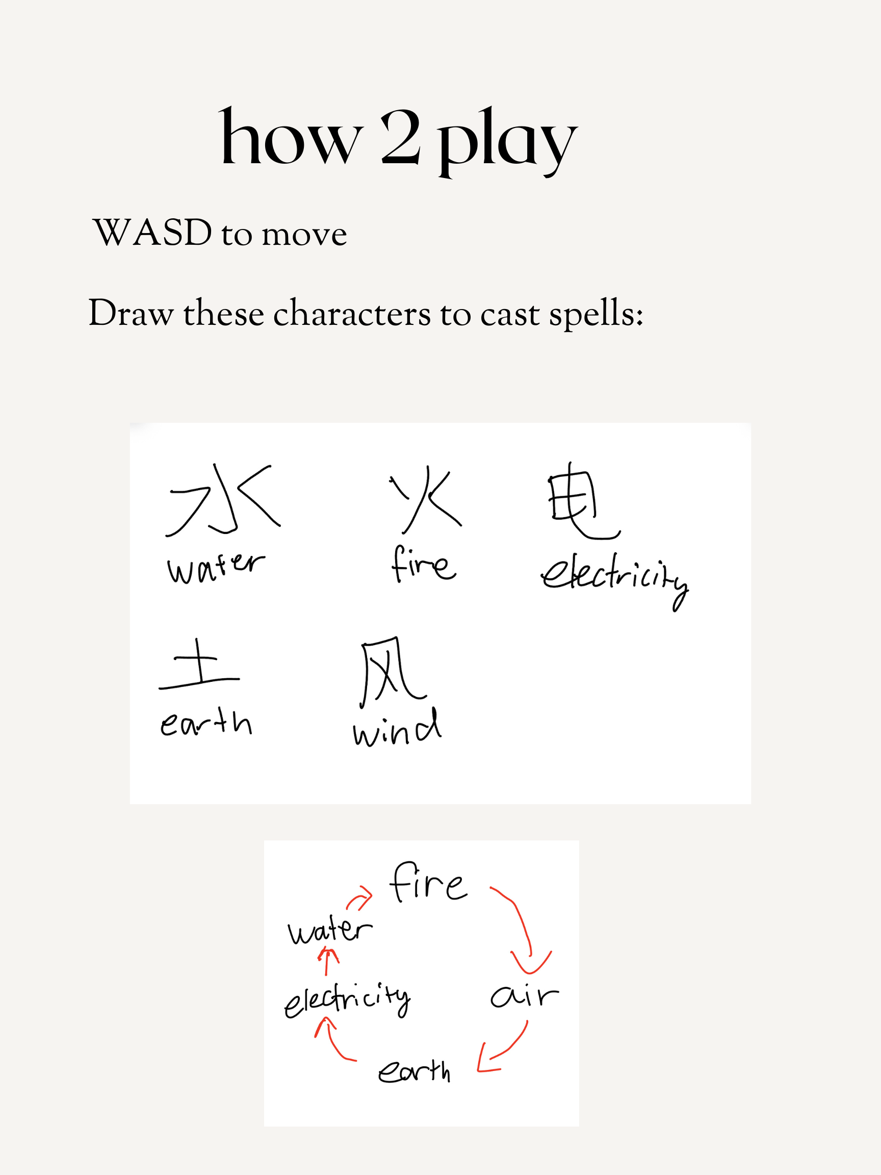 The goal of the game is to survive as long as possible! Draw the Chinese characters (in the top right of the screen) in order to switch between elements and attacks!